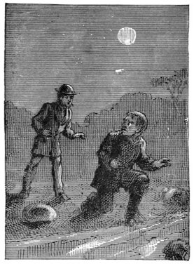 two boys flew on and on, toward the village, speechless with horror. They glanced backward over their shoulders from time to time, apprehensively, as if they feared they might be followed. Every stump that started up in their path seemed a man and an enemy, and made them catch their breath; and as they sped by some outlying cottages that lay near the village, the barking of the aroused watch-dogs seemed to give wings to their feet.