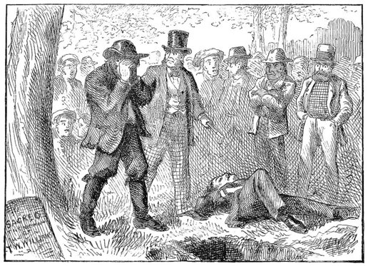 All the town was drifting toward the graveyard. Tom’s heart-break vanished and he joined the procession, not because he would not a thousand times rather go anywhere else, but because an awful, unaccountable fascination drew him on. Arrived at the dreadful place, he wormed his small body through the crowd and saw the dismal spectacle. It seemed to him an age since he was there before. Somebody pinched his arm. He turned, and his eyes met Huckleberry’s. Then both looked elsewhere at once, and wondered if anybody had noticed anything in their mutual glance. But everybody was talking, and intent upon the grisly spectacle before them.