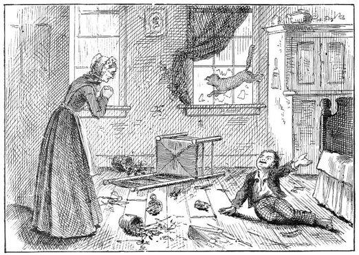 Peter was agreeable. So Tom pried his mouth open and poured down the Pain-killer. Peter sprang a couple of yards in the air, and then delivered a war-whoop and set off round and round the room, banging against furniture, upsetting flower-pots, and making general havoc. Next he rose on his hind feet and pranced around, in a frenzy of enjoyment, with his head over his shoulder and his voice proclaiming his unappeasable happiness. Then he went tearing around the house again spreading chaos and destruction in his path. Aunt Polly entered in time to see him throw a few double summersets, deliver a final mighty hurrah, and sail through the open window, carrying the rest of the flower-pots with him. The old lady stood petrified with astonishment, peering over her glasses; Tom lay on the floor expiring with laughter.