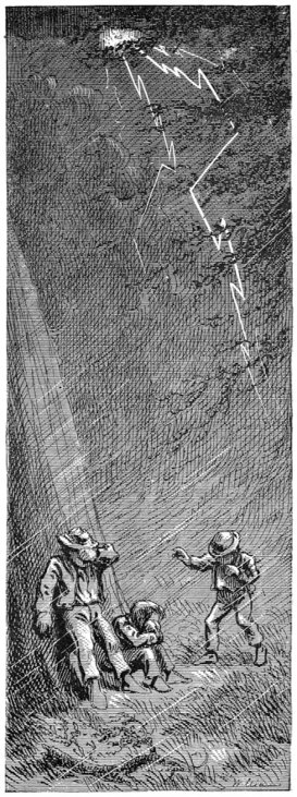 About midnight Joe awoke, and called the boys. There was a brooding oppressiveness in the air that seemed to bode something. The boys huddled themselves together and sought the friendly companionship of the fire, though the dull dead heat of the breathless atmosphere was stifling. They sat still, intent and waiting. The solemn hush continued. Beyond the light of the fire everything was swallowed up in the blackness of darkness. Presently there came a quivering glow that vaguely revealed the foliage for a moment and then vanished. By and by another came, a little stronger. Then another. Then a faint moan came sighing through the branches of the forest and the boys felt a fleeting breath upon their cheeks, and shuddered with the fancy that the Spirit of the Night had gone by. There was a pause. Now a weird flash turned night into day and showed every little grassblade, separate and distinct, that grew about their feet. And it showed three white, startled faces, too. A deep peal of thunder went rolling and tumbling down the heavens and lost itself in sullen rumblings in the distance. A sweep of chilly air passed by, rustling all the leaves and snowing the flaky ashes broadcast about the fire. Another fierce glare lit up the forest and an instant crash followed that seemed to rend the tree-tops right over the boys’ heads. They clung together in terror, in the thick gloom that followed. A few big raindrops fell pattering upon the leaves.