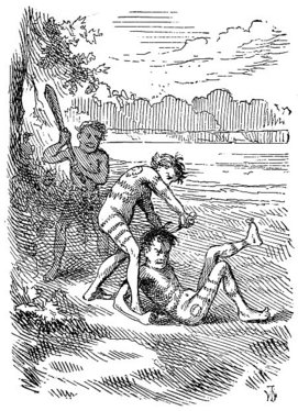 As the sun began to steal in upon the boys, drowsiness came over them, and they went out on the sand-bar and lay down to sleep. They got scorched out by and by, and drearily set about getting breakfast. After the meal they felt rusty, and stiff-jointed, and a little home-sick once more. Tom saw the signs, and fell to cheering up the pirates as well as he could. But they cared nothing for marbles, or circus, or swimming, or anything. He reminded them of the imposing secret, and raised a ray of cheer. While it lasted, he got them interested in a new device. This was to knock off being pirates, for a while, and be Indians for a change. They were attracted by this idea; so it was not long before they were stripped, and striped from head to heel with black mud, like so many zebras – all of them chiefs, of course – and then they went tearing through the woods to attack an English settlement.
