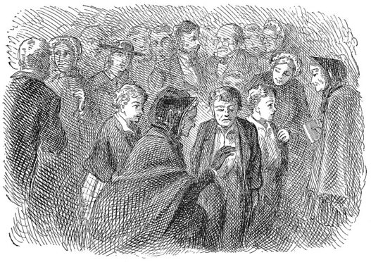 Aunt Polly, Mary, and the Harpers threw themselves upon their restored ones, smothered them with kisses and poured out thanksgivings, while poor Huck stood abashed and uncomfortable, not knowing exactly what to do or where to hide from so many unwelcoming eyes. He wavered, and started to slink away, but Tom seized him and said: