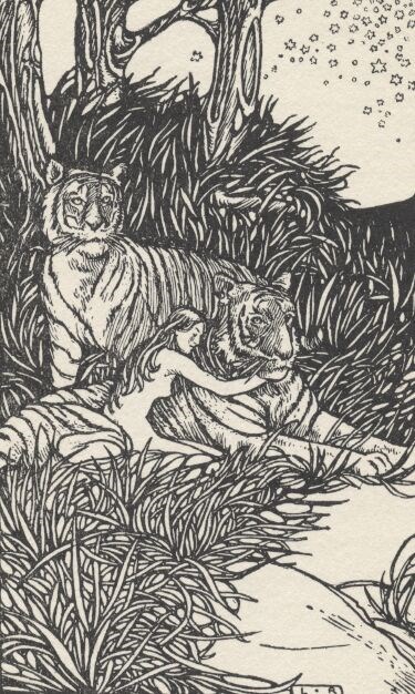I couldn’t get back home; it was too far and turning cold; but I found some tigers and nestled in among them and was most adorably comfortable, and their breath was sweet and pleasant, because they live on strawberries. I had never seen a tiger before, but I knew them in a minute by the stripes. If I could have one of those skins, it would make a lovely gown.