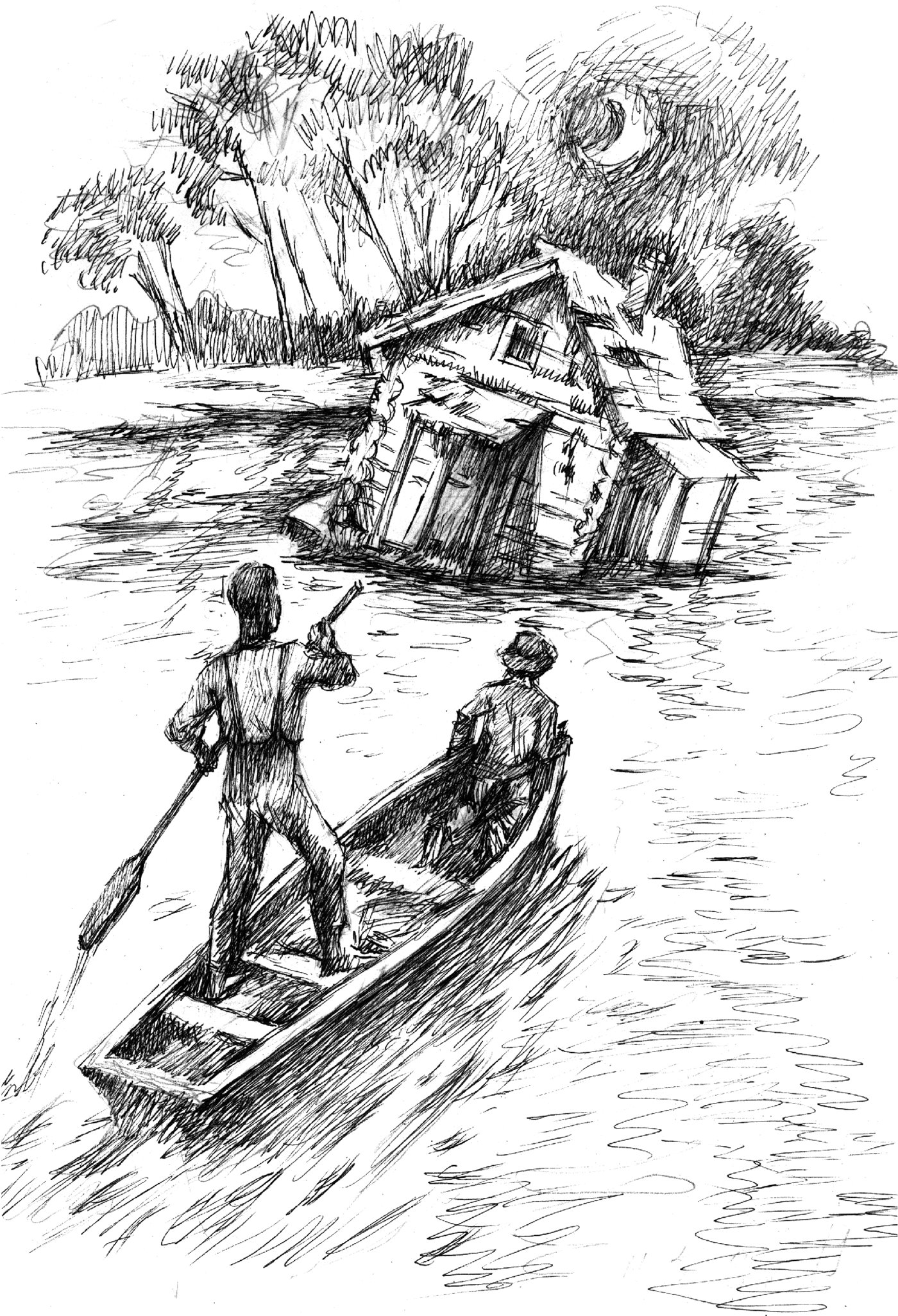 Mən ona heç baxmadım. Cim onun üstünü evdən tapdığı cır-cındır ilə cəld örtdü. Divardan iki köhnə çit qadın paltarı və bəzi kişi geyimləri asılmışdı. Bizim əlimizə bunlar keçdi: köhnə tənəkə fənər, təzə cib bıçağı, xeyli şam, cırıq pambıq yorğan, kiçik bir balta, bir qədər mismar və iri qarmaqları olan bir tilov. Biz bu əşyaları qayığa daşıdıq, onlara ehtiyacımız ola bilərdi. Artıq yığışıb getməyə hazırlaşanda isə mən bir həsir şlyapa da tapdım.