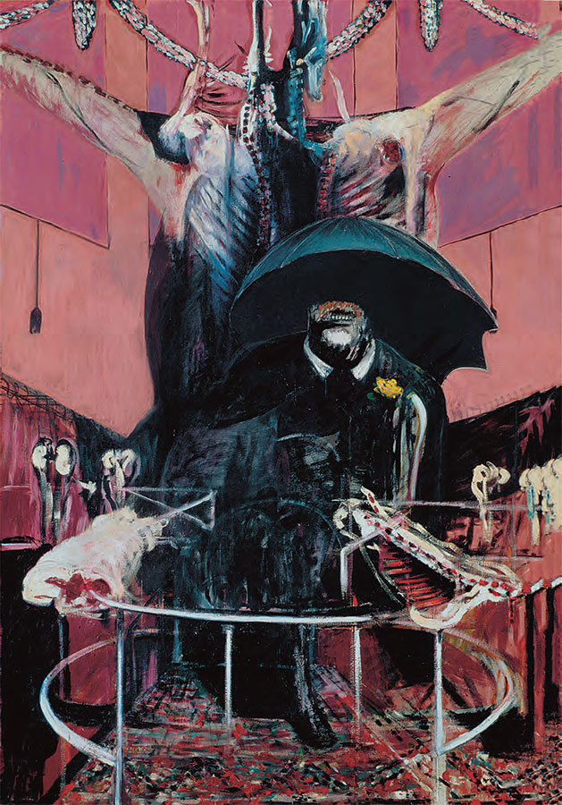 Это, разумеется, была та связь, которую проводил Бэкон. Но, рассуждая рационально, это скопление – продовольственный отдел Harrods, диктатор-оратор, зонтик и собственный ковер Бэкона – бессмысленно. В определенном смысле перед нами послание. Это распятие, но не то, что ведет к воскресению и искуплению, скорее оно являет собой страдание и мертвую плоть, и над всем этим главенствует тоталитарный деспот. Это запрестольный образ, выполненный в великолепных мрачных тонах и связанный лишь с бессмысленным страданием и жестокостью.