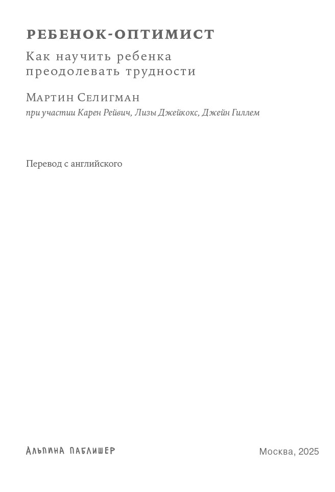 В этой книге я рассказываю о программе иммунизации школьников, об исследованиях оптимизма и беспомощности, которые мы с коллегами проводили в течение последних 30 лет. Мы рассмотрим и источники пессимизма, и его последствия. Я объясню, что делать, если вы заметили у ребенка тревожные симптомы, и как преобразовать его пессимизм в оптимизм, а беспомощность – в уверенность в себе. И помните: на карту поставлено будущее ваших детей.