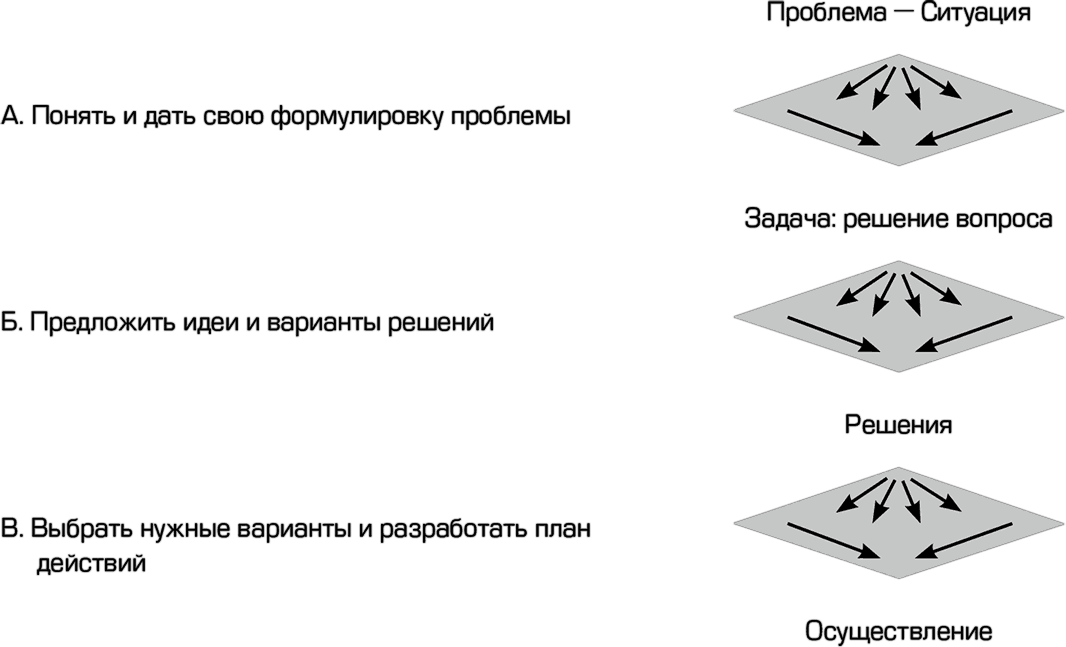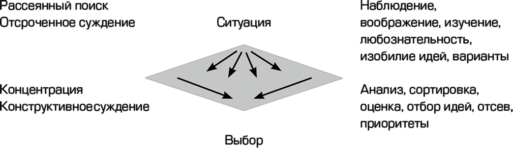 В процессе креативного мышления последовательно переходим от одной фазы к другой. Их последовательность неизменно оказывается продуктивной, но лишь при условии их четкого отделения друг от друга.