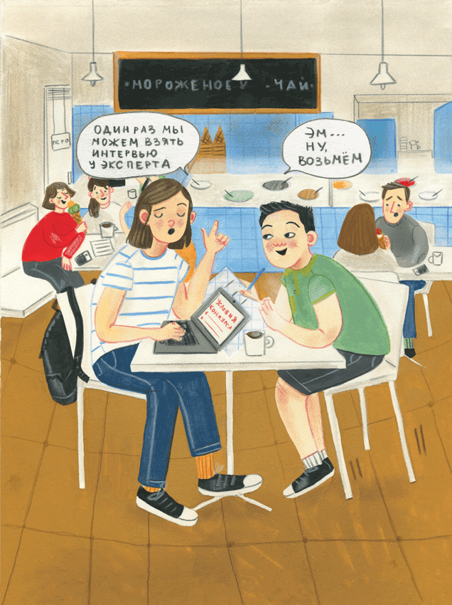 Маша и Макс встретились в кафе у Машиного дома, чтобы обсудить конкурс не по телефону. К тому же по телефону мороженое не поешь, а в кафе – пожалуйста.