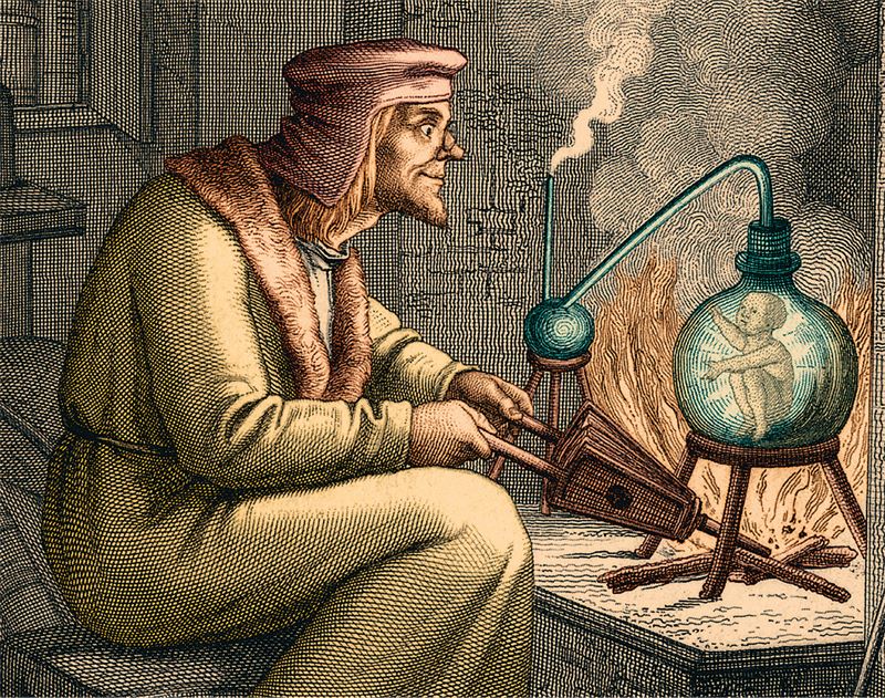 Алхимик работает над созданием гомункула. Гравюра