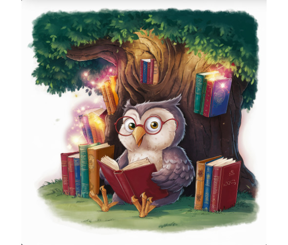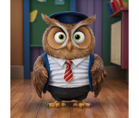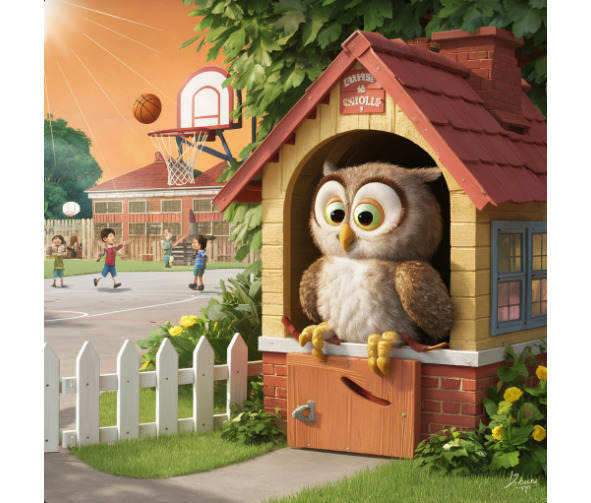 Underneath the sprawling branches of a majestic oak tree, nestled in the heart of the schoolyard, sat Amalia the owl. With her feathers ruffled by the gentle breeze and her eyes alight with curiosity, she perched upon a thick branch, surrounded by a pile of books taller than herself.