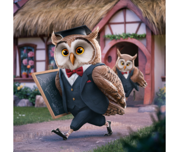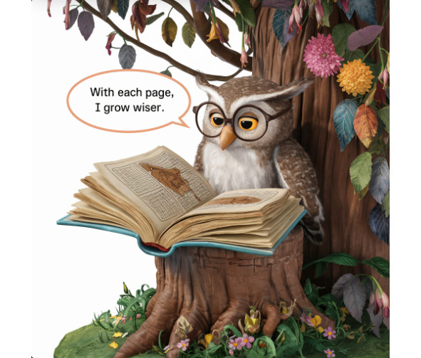 Initially, in the enchanted forest of Whispering Pines, there lived a wise old owl named Melany. Unlike other owls who spent their nights hunting, Melany’s heart was filled with a love for books and stories. One day, she discovered a magical library hidden deep within the forest, and she knew it was her destiny to become its librarian. With patience and kindness, Melany taught the children of the forest the joy of reading and the power of imagination. Through her guidance, the children learned to unlock the secrets of countless worlds within the pages of books, discovering that knowledge is the greatest treasure of all. And so, the little owl named Melany became not only the librarian of Whispering Pines but also the guardian of dreams and the bringer of endless possibilities to all who entered her magical library.