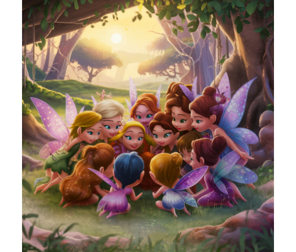 At the appointed meeting place – a sunlit glade at the heart of the forest – the fairies came together, their faces radiant with excitement. They perched on the branches of trees and settled on the soft moss-covered ground, forming a colorful and bustling assembly.