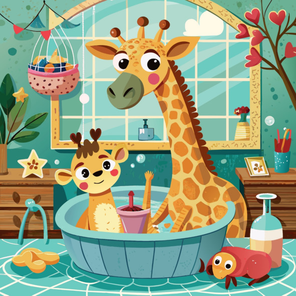 As the sun dipped low in the sky and the shadows lengthened across their cozy jungle home, Penny, the loving giraffe mom, decided it was time to bathe her beloved little giraffe, Nicholas. With a gentle smile and a warm heart, she led Nicholas to the large bathtub in their bathroom, filled with warm, inviting water.