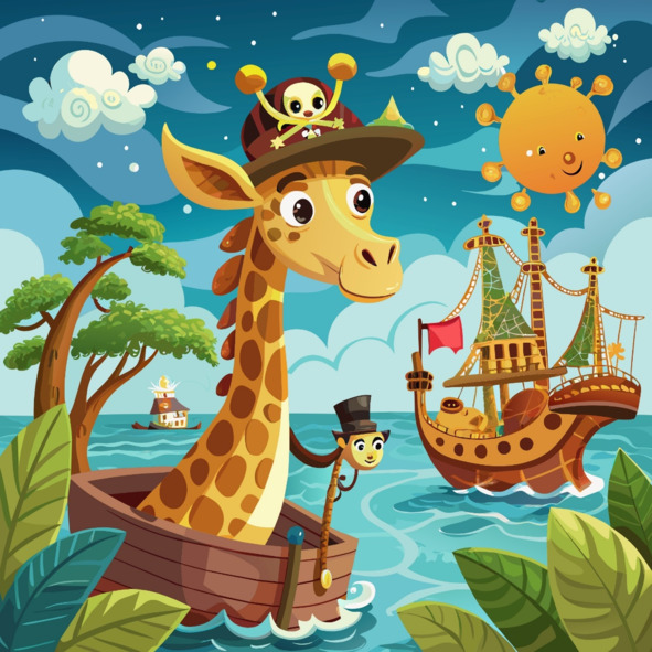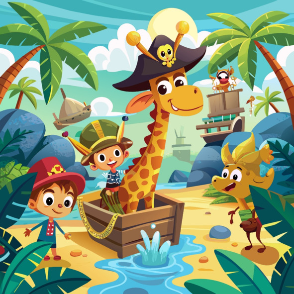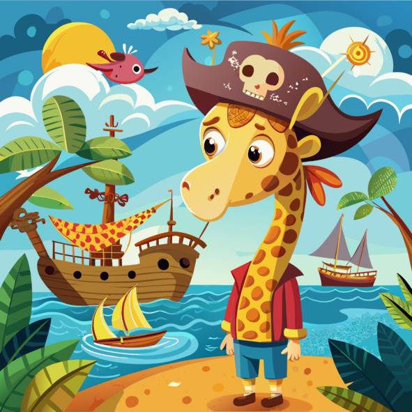 As he looked around, he realized that he was no ordinary giraffe – he was the captain of this grand vessel, the fearless leader of a daring crew of pirate animals. With a proud smile, he surveyed his loyal crewmates, their faces alight with determination and courage.