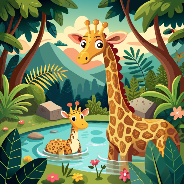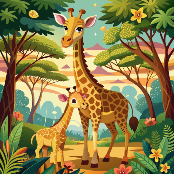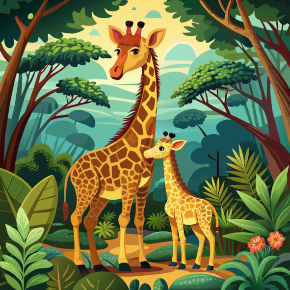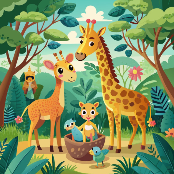 At the heart of a lush, green jungle, there stood a cozy little house nestled among the towering trees. This wasn’t just any house; it was the home of a special family of giraffes. Tall and graceful, with necks reaching high into the sky, they roamed the jungle with gentle elegance.