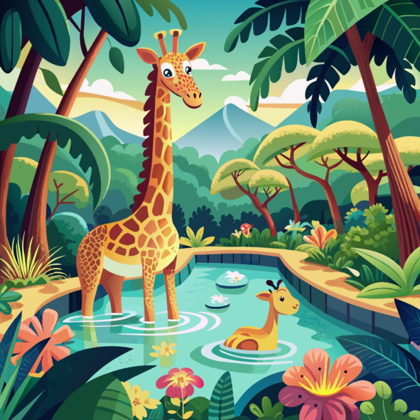 On a bright and sunny morning in the heart of the jungle, Penny, the gentle giraffe mom, had a special surprise planned for her beloved little giraffe, Nicholas. With a twinkle in her eye and a skip in her step, she led Nicholas to a secluded corner of their jungle home where a large, gleaming tub awaited them.