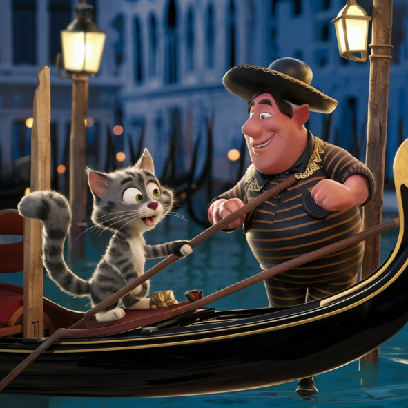 Гондола грациозно скользила по безмятежным водам Венеции, и кот Осман воспользовался случаем, чтобы завязать разговор с гондольером Тонни. С любопытством наклонив голову и слегка взмахнув хвостом, Осман подошел к Тонни, его золотистые глаза загорелись интересом.