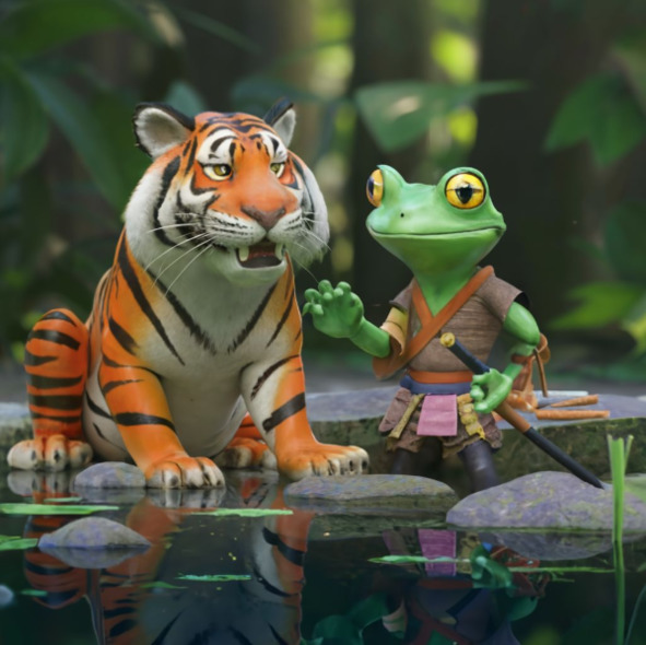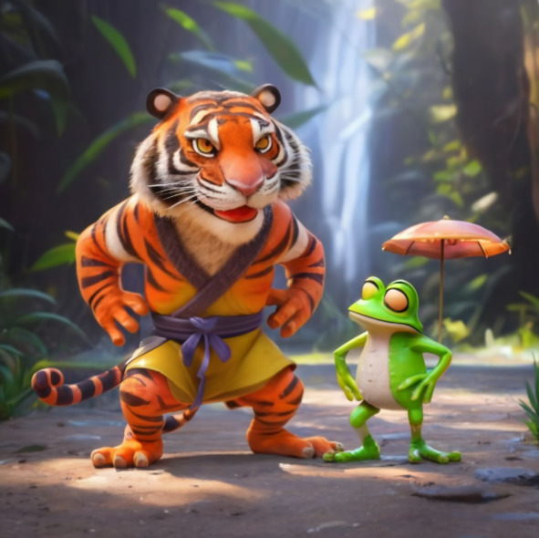 Иден представлял собой великолепное зрелище, с гладким оранжевым мехом и пронзительными янтарными глазами, которые светились решимостью. Его присутствие было властным, но сердце у него было нежным и добрым. Несмотря на свою грозную внешность, он питал слабость к любопытной маленькой лягушке, которая прыгала вокруг с безграничной энергией.