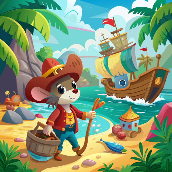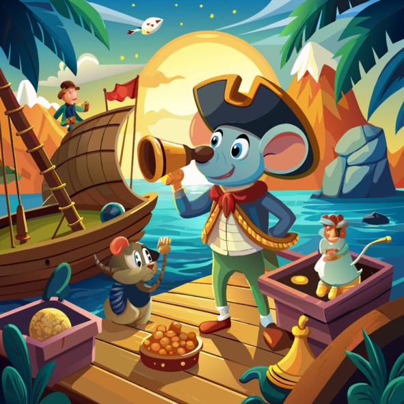 Со своего наблюдательного пункта в мышиной норе мышь Тео с благоговением наблюдала, как пираты выгружают свой груз, их смех эхом разносился в соленом воздухе. Мышонок внимательно слушал их рассказы о скрытых бухтах и зарытых сокровищах, его усики подергивались от возбуждения.