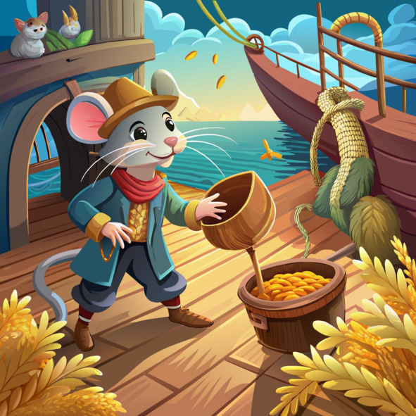 У мышки Тео была миссия – стащить несколько драгоценных зерен из мешков, хранящихся в грузовом отсеке корабля. С каждым крошечным шагом он приближался к своей цели, его глаза сияли предвкушением при мысли о брюхе, полном украденных сокровищ.