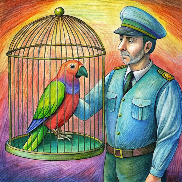 Профессор Орландо в своем поэтическом восторге не заметил, что с его любимым попугаем происходит что-то странное. Коко, всегда любознательная душа, выпрыгнула из рук Профессора и приземлилась на край мензурки, наполненной ярко-зеленым зельем. Он был загипнотизирован его ярким свечением и странным новым запахом, который, казалось, танцевал вокруг него.