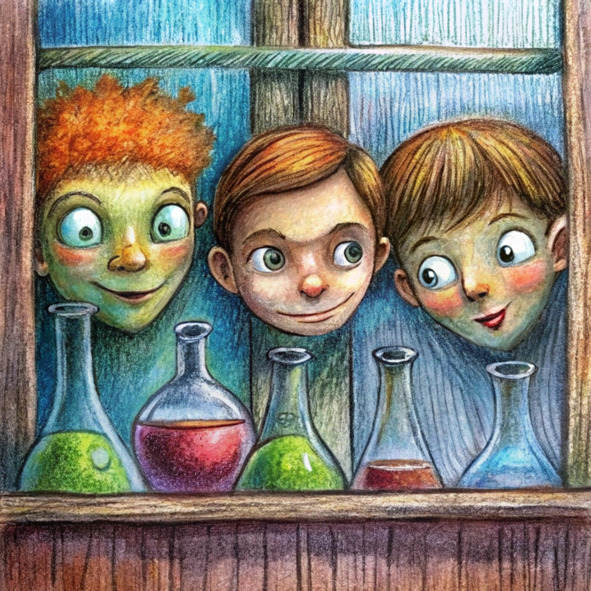 В этот самый момент трое маленьких детей, Тимми, Лили и Макс, игравшие в пятнашки в саду за лабораторией, были привлечены шумом, доносившимся из дома профессора. Они прижались носами к оконному стеклу, вглядываясь в странную и чудесную лабораторию.