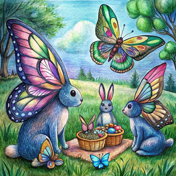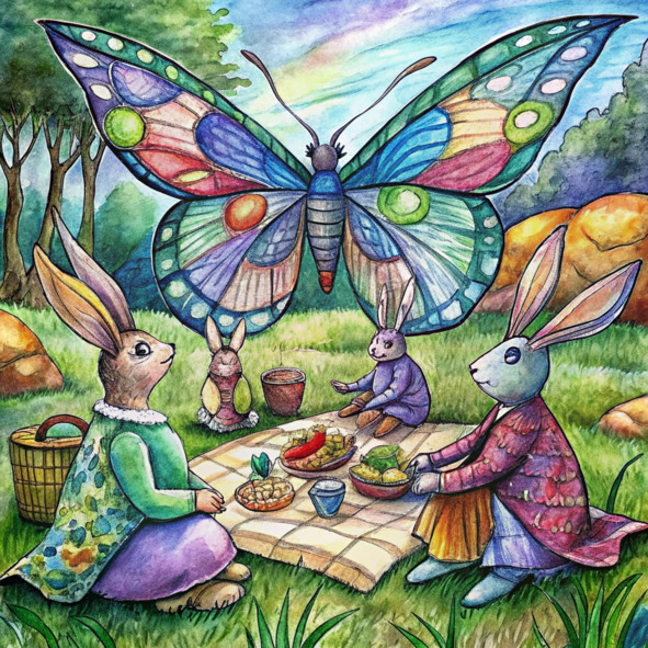 Мать-крольчиха с мягким пушистым серым мехом была окружена своими малышами. Их маленькие носики подергивались, когда они откусывали от сочных красных ягод, а глаза блестели от восторга. Папа Кролик сидел у журчащего источника, наполняя свою лейку прохладной, освежающей водой.