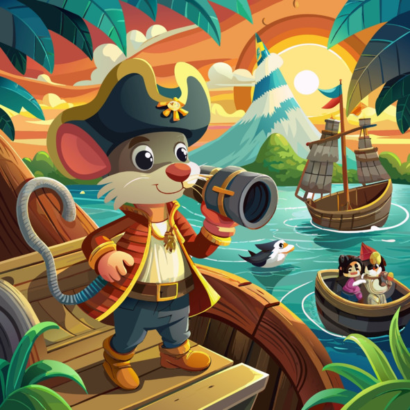 Initially in a faraway land, there lived a brave and adventurous mouse named Theo. Theo loved nothing more than to explore and seek out tasty treats, especially grain. One day, while scurrying near the docks, Theo climbed onto a magnificent pirate ship in search of a delicious snack. Little did she know, the pirates caught her red-handed! Instead of punishing Theo, the pirates saw her bravery and cleverness, and offered her an unexpected proposition: join their crew and become a pirate! Excited by the prospect of adventure, Theo accepted, and together they sailed the high seas in search of treasure. Join Theo on this enchanting journey as she learns the true meaning of friendship, bravery, and the thrill of seeking treasure in this delightful children’s fairy tale.