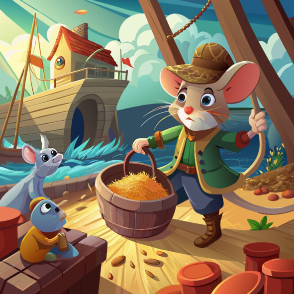 And there, amidst the cargo hold filled with sacks of grain and provisions, Theo’s mouse found its prize. With quick movements, it darted forward and seized a small handful of grain, its tiny paws working diligently to gather as much as it could carry.