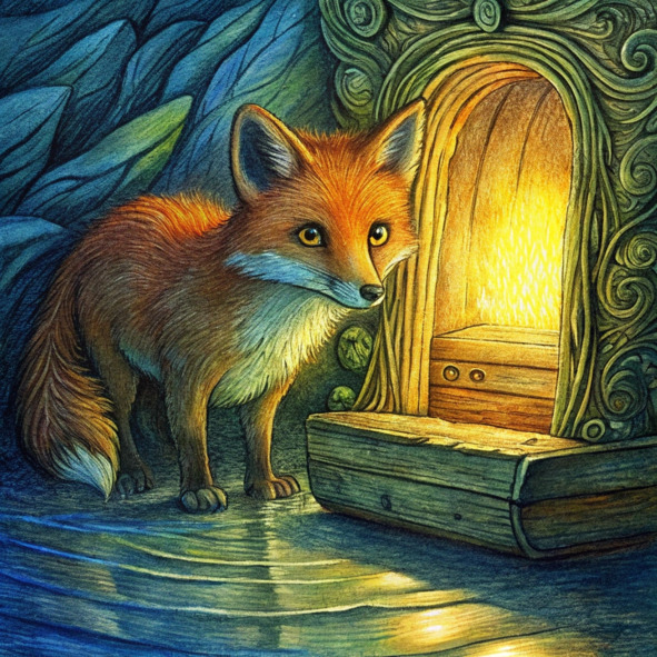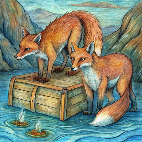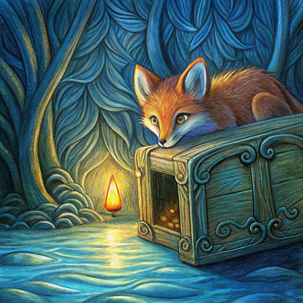 Три маленьких лисенка сгрудились вокруг древнего сундука, их дыхание туманило прохладный воздух. Они наконец вытащили тяжелое сокровище из глубин реки, и теперь оно лежало перед ними, сияя тайной, древней, как само время.