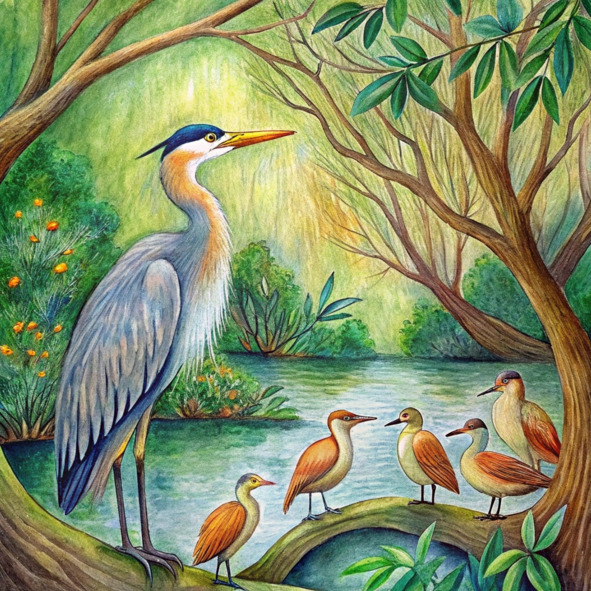 – Обернувшись, они увидели черепаху, такую же старую, как сама река. Она сидела, взгромоздившись на покрытый мхом валун, его глаза светились древней мудростью.