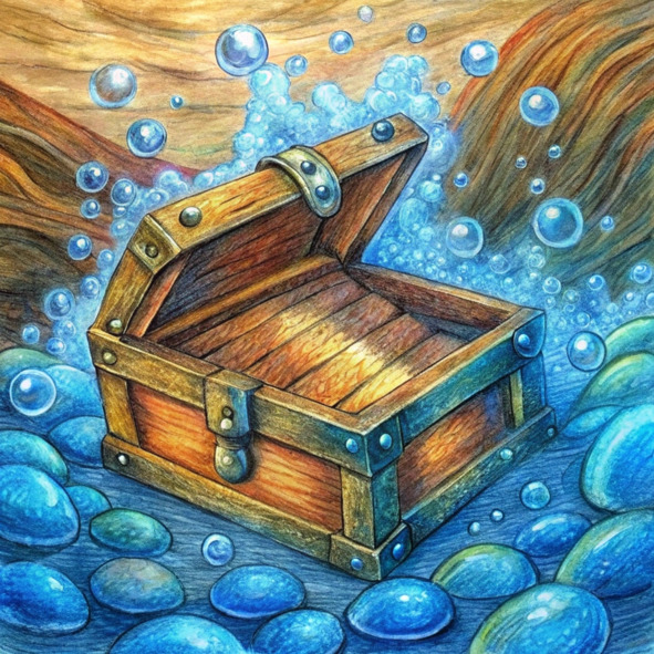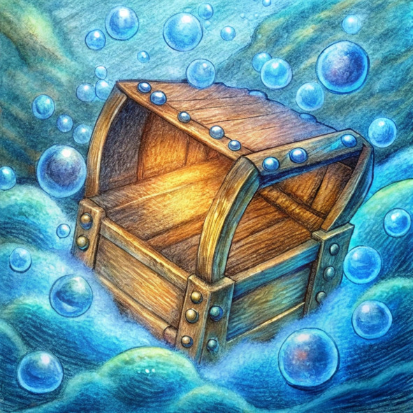 Открыв глаза, она теперь отчетливее видела сундук. Солнечный свет просачивался сквозь воду, подчеркивая замысловатую резьбу, украшавшую деревянную поверхность. Странные символы, закрученные линии и выцветшие портреты, казалось, танцевали под мерцающей водой.