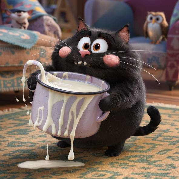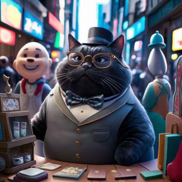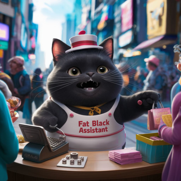 В шумном городе, наполненном яркими огнями и оживленными улицами, жил пухлый черный кот по имени Матео. Матео был не просто обычным котом – он работал продавцом в маленьком уютном супермаркете под названием Lucas Store.