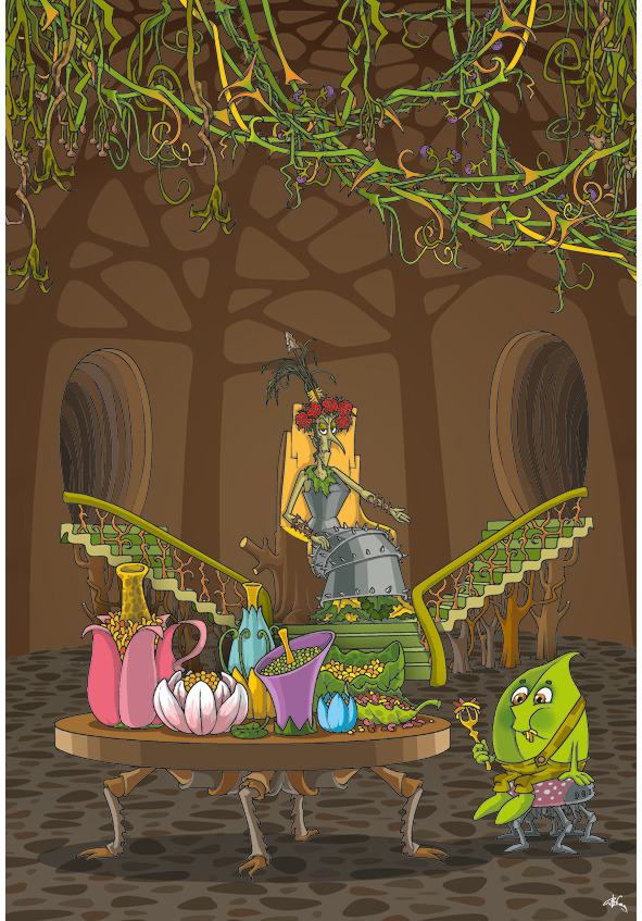 Слуги приволокли Фикуса во дворец к Колючке. Его поразило, что в жилище Царицы повсюду были высохшие растения. Пучки зелени, почерневшие от сажи, свисали с потолка; поникшие головки гвоздик тоскливо пылились в углу; гнилые фрукты валялись под ногами и источали гадкий смрад, а стены украшали приколоченные гвоздями сухие листья всех мастей. Это было настоящее кладбище растений, и малыш Фикус содрогнулся от ужаса, представляя себе, какая страшная участь его ожидает.