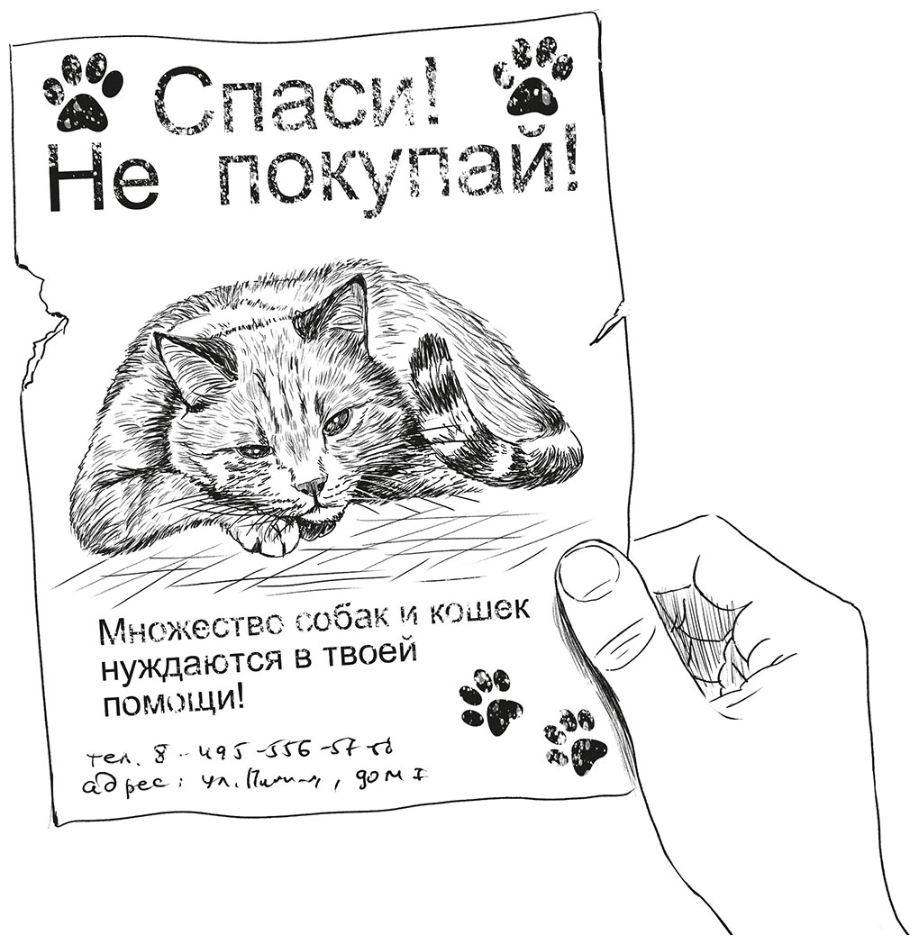 И он достал листочек с фотографией рыжего кота. Сверху было крупно написано: «Спаси! Не покупай!»