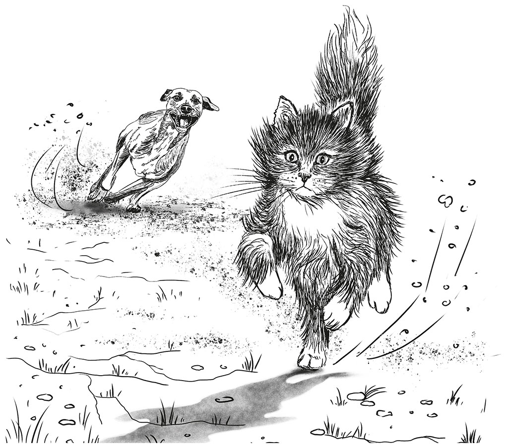 Затем раздался грозный рык, и собака прыгнула. Но я всё же успел сгруппироваться. Вскочил и побежал, выискивая убежище. Я не понимал, куда бежать, и метался по двору, а пёс нёсся по пятам, рыча и лая. Увидев водосточную трубу, я собрал остатки сил и подпрыгнул. Собака лаяла нервно, переходя на визг. Когти скрежетнули по железу, но боли я не почувствовал. Лапы разжались, и я полетел вниз.