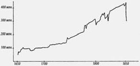 Рис. 1. Численность населения Китая в XVII–XIX веках (реконструкция Чжоу Юаньхэ[4]). Скачкообразный рост показателей в 1740-х и 1770-х годах объясняется улучшением учета, падение в 1810-х и 1820-х годах – прекращением учета в областях, охваченных восстаниями