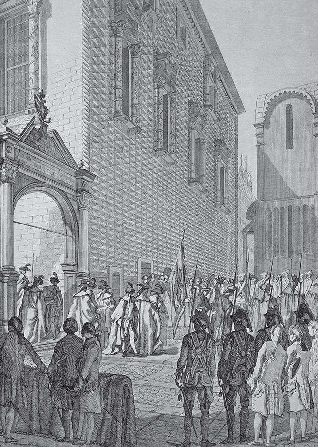 Торжественное шествие императрицы Екатерины II с Красного крыльца в Успенский собор. Д. Андрузский с гравюры С. Путимцева по оригиналу Ж. Девельи и М. Махаева. 2-я пол. XIX в. Фрагмент