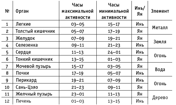 Из этой таблицы видно, что кругооборот энергии начинается с легких. Связано это с тем, что воздух – это основной поставщик Ци. Далее энергия за сутки последовательно проходит все 12 основных парных меридианов, находясь в каждом из них по 2 часа. Два непарных канала (передне- и заднесрединные) работают круглосуточно.