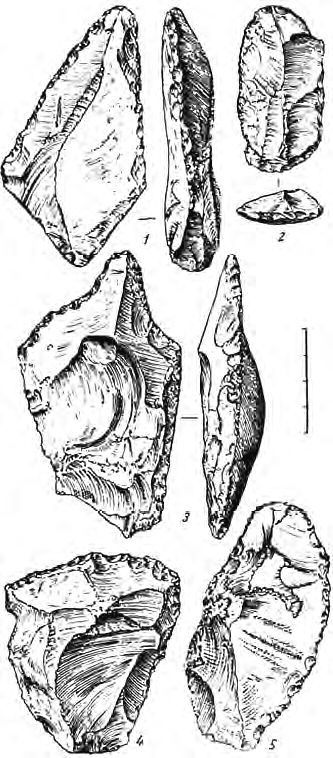 Рис. 1.2. Так выглядели орудия труда питекантропов, найденные около города Шелль (Франция): 1 – массивный остроконечник; 2 – нож; 3 – сверло; 4–5 – скребки [107]