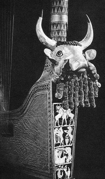 Рис. 1.1. Голова быка – деталь музыкального инструмента (лиры). Деревянная основа, обложенная тонким листовым золотом, ляпис-лазурь, дерево. Из царских гробниц шумеров в городе Ура, Месопотамия. 2685 г. до н. э. Филадельфия, Музей Университета.