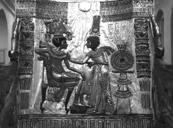 Рис. 1.2. Парадный трон Тутанхамона из гробницы Тутанхамона в Долине царей (Фивы). Середина 14 в. до н. э. Египетский музей Каир. Спинку трона украшают гибкие фигуры царственной четы, выгравированные на золотом листе, со вставками из самоцветов, серебра, фаянса и цветного стекла.