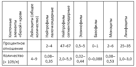 В норме содержание лейкоцитов (всех видов – см. далее «Лейкоцитарная формула») в крови составляет 4–9 × 109/л.