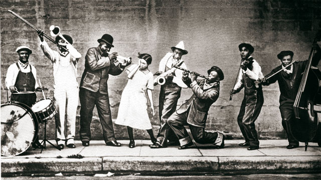Эти источники и составные части, исторически легшие в основу джаза, – духовные песни и светские блюзы, а также рабочие песни и песни бродячих менестрелей, – оставались длительное время вокальной формой исполнительства. Но современное музыко- и джазоведение все-таки начинает отсчет истории джаза с создания ансамблей с различным составом инструментов, прежде всего духовых – труба, корнет, тромбон, кларнет, туба и т. д. Ход событий в Америке этому всячески способствовал: когда окончилась война между Севером и Югом и были расформированы армии, множество духовых инструментов армейских оркестров стало доступными для простого люда и попало в руки музыкальных безымянных чернокожих героев первых джазовых ансамблей. На них появился устойчивый спрос, особенно в южных штатах и в частности, в Луизиане, в Новом Орлеане, где ни одно увеселительное мероприятие уже не мыслилось без духового оркестра. Новый Орлеан вырастил еще одну живительную ветвь сложившейся музыки темнокожих американцев. Будучи тесно связанным с Францией, он дал поколение потомков от браков негров и французов (а также и испанцев) – креолов, знавших европейскую музыку и умевших играть по нотам! Появились и явные лидеры, объединявшие умеющих играть. Так образовались ансамбли, ставшие к началу двадцатого века исполнять музыку поначалу достаточно примитивную, а с временем оформившуюся в своеобразный стиль исполнения который уже можно назвать джазом. Ранним, но – джазом.