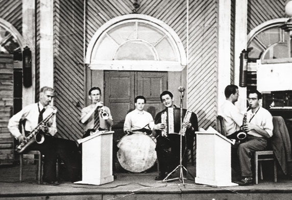 Танцверанда Измайловского ПКиО. Ансамбль Б. И. Крупышева (первый слева). Москва,1955 (из архива М. Кляцкина)