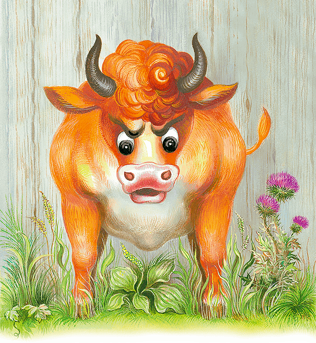 Услышал он, что Волка обижают, выбил рогами дверь, так что Волк даже в сторону отлетел, да как набросится на непрошеных гостей!