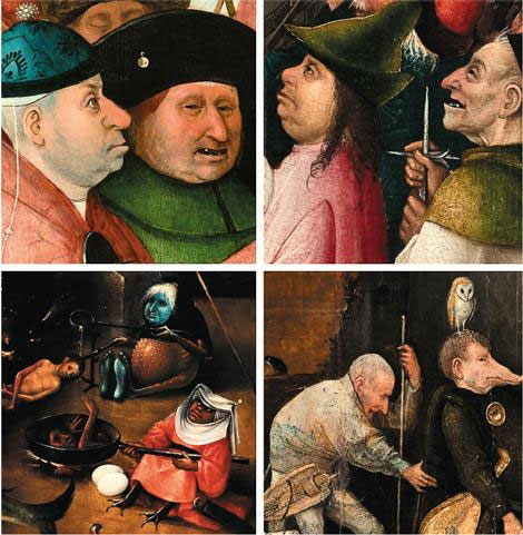 Рис. 6. Иероним Босх. Лица демонов и грешников – фрагменты панелей «Несение креста» (Эскориал), «Се человек» (Франкфурт), «Страшный суд» (Вена), «Искушение св. Антония» (Лиссабон).