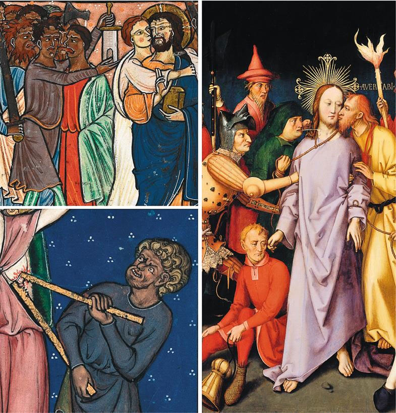 Некоторые из деталей таких изображений приобретали негативное значение лишь в определенных контекстах. Так, хорошо известно, что с XIII в. Иуду Искариота и иудеев часто изображали в желтых одеждах, поскольку желтый цвет ассоциировался с иноверием, предательством и безумием. Однако злодеев, конечно же, одевали не только в желтый, а желтая туника или желтый плащ необязательно указывали на то, что их обладатель – злодей. В тот же цвет могли быть выкрашены одеяния ангелов или св. Петра – первого из апостолов. Для того чтобы разобраться в символике цвета, важно смотреть не на одного персонажа, а на всю гамму, которую использует тот или иной мастер при изображении позитивных, негативных и нейтральных фигур, а также присматриваться к оттенкам (скажем, негативным знаком мог быть не любой желтый, а только «грязный», отдающий в красный или зеленый)[20].