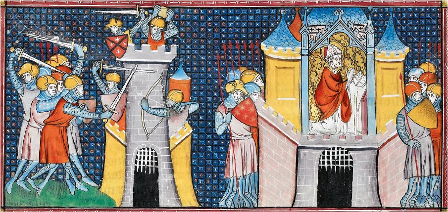 11. Гунны в 451 г. осаждают город Аврелиан (современный Орлеан) в Галлии. На этой французской миниатюре XIV в. завоеватели-степняки ни по цвету кожи, ни по чертам лица, ни по вооружению не отличаются от защитников города. При этом в той же рукописи сарацины – враг недавний и хорошо знакомый – зримо противопоставлялись христианам одеждой и цветом кожи – их лица почти черны (Fol. 440v, 442).