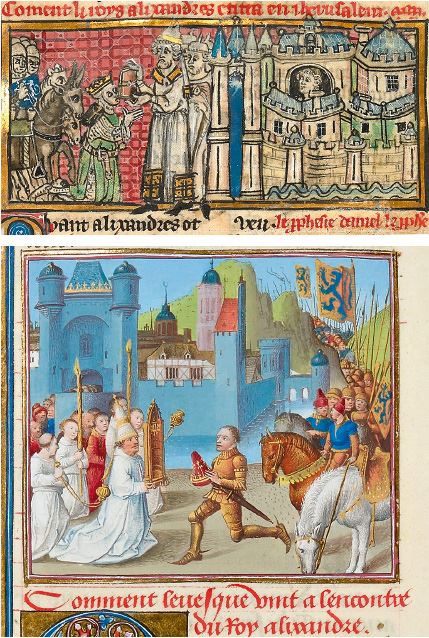 Внизу: Первосвященник одет в высокую тиару, которая напоминает папскую и увенчана крестом. Он протягивает Александру для поклонения предмет, похожий на половину футляра, в котором в Средние века хранили свитки Торы. Иерусалим сзади выглядит как североевропейский город с фахверковыми домами, однако на башнях установлены полумесяцы.